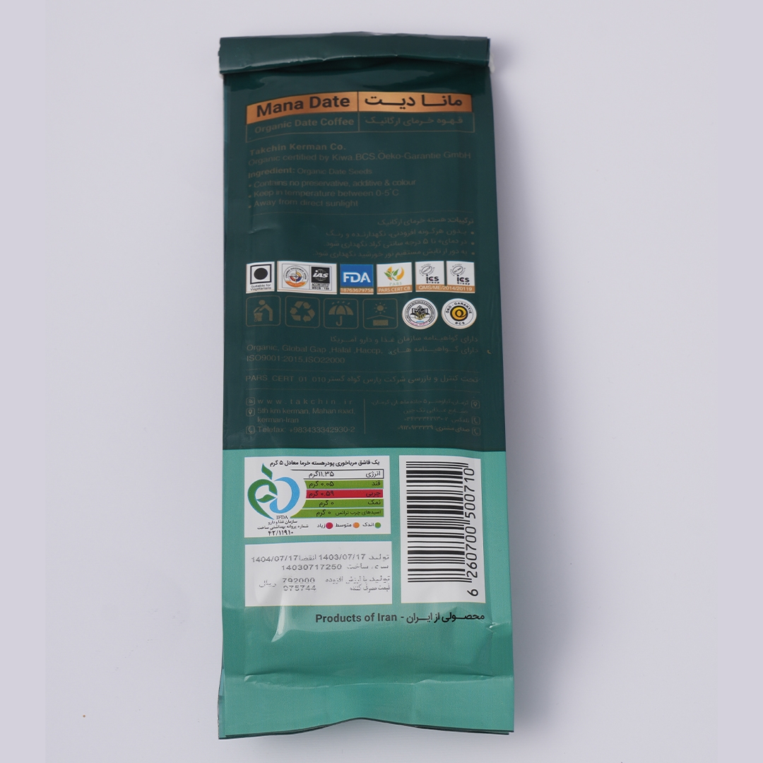 نوشیدنی سلامتمحور با گواهینامههای بینالمللی این قهوه خرما ارگانیک دارای تاییدیههای معتبر از اتحادیه اروپا و آمریکا (FDA) است. مصرف این محصول به دلیل طبیعت گرم و مواد معدنی غنی، به تقویت سیستم ایمنی و بهبود عملکرد گوارش کمک شایانی میکند.